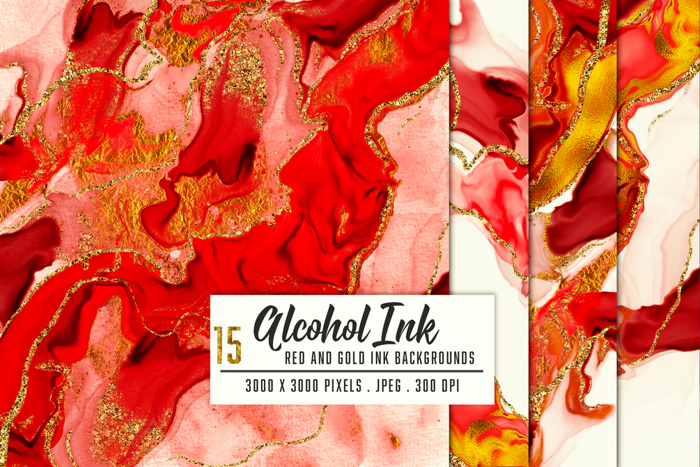 A collection of Luxury Red and Gold alcohol ink backgrounds. Liquid ink backgrounds pack. Watercolor and alcohol ink painted textures in various styles and designs. Pretty red, maroon, burgundy color shades backdrops with gold sparkle.